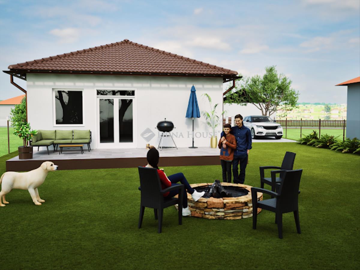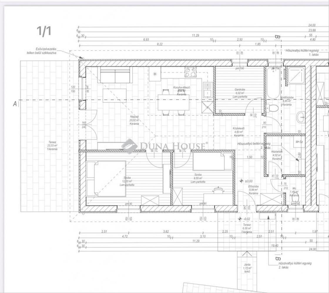 Kialakítása: 2 szoba, tágas amerikai nappali konyha, háztartási helyiség, gardrób, előtér, közlekedő, fürdő+wc, külön wc, nyitott terasz.