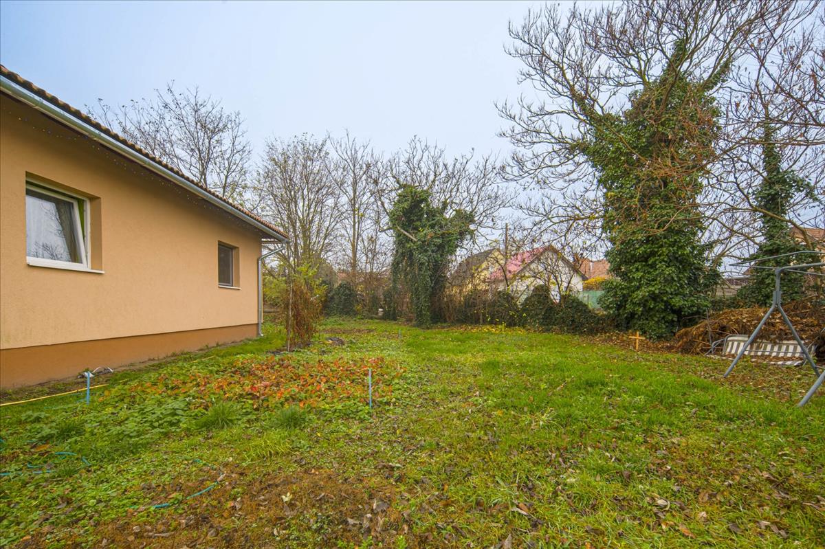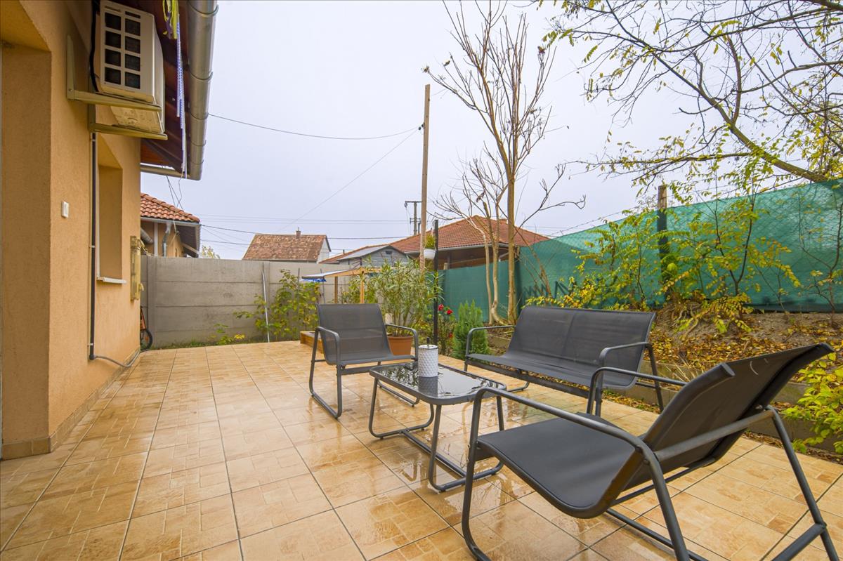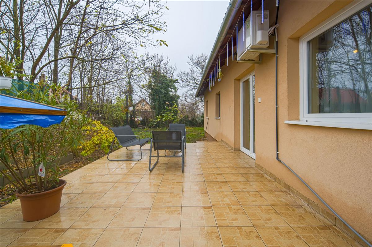 Az ingatlan a 22 m²-es garázson keresztül kapcsolódik a szomszédos épülethez. a nagyméretű teraszra a nappaliból lehet kilépni, és a telek elrendezésének köszönhetően az ingatlan szinte teljesen körbejárható.