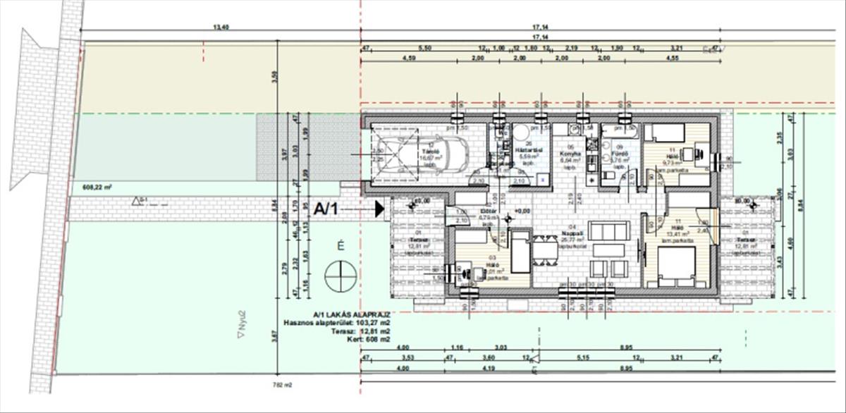 Az ingatlan Hasznos alapterület: 103, 27 m2 Terasz: 25, 62 m2 Kert: 608 m2