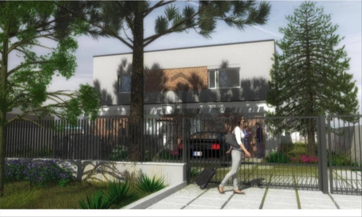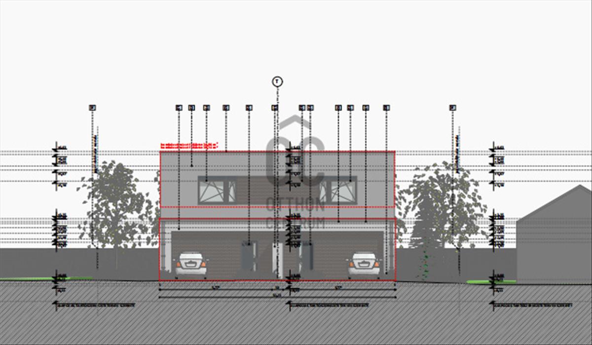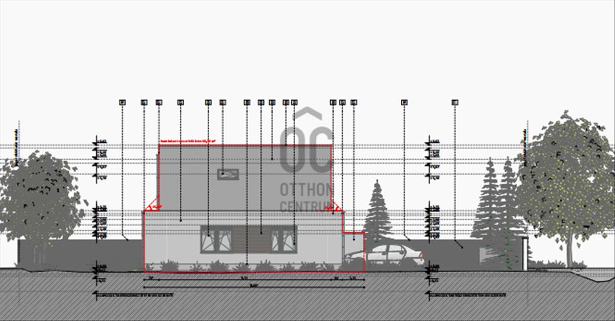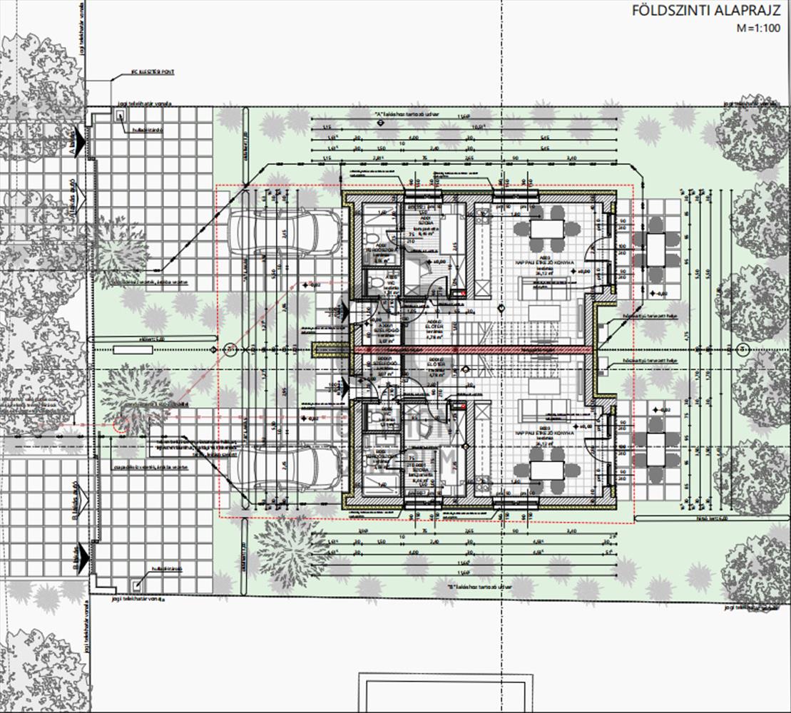 Az emeleten további két szoba és fürdőszoba tervezett. a földszinti nappalihoz csatlakozik az udvari, részben fedett terasz. a két lakáshoz tartozó udvarrész közé kerítés elhelyezése tervezett.