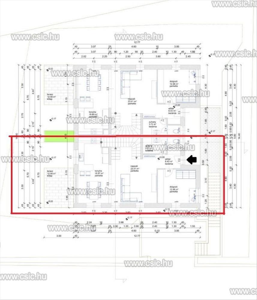 Nappali + 3 szoba, 2 fürdőszoba nyújt komfortos életteret lakói számára. a hatalmas emeleti hatalmas teraszról élvezhetjük a csendet, a természetet, pazar kilátás nyílik a hegyekre. Az ikerházhoz saját kertrésszel tartozik, ahová a nappaliból juthatunk ki.