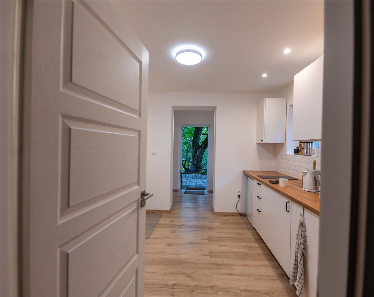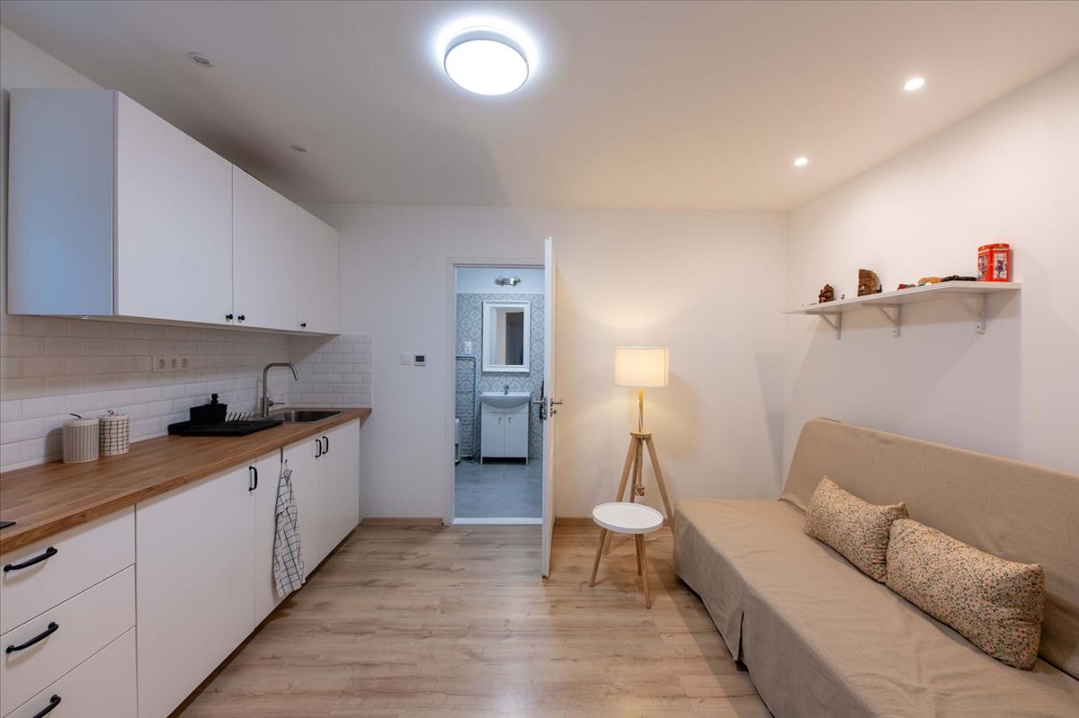 A 25 m²-es, közvetlen kertkapcsolattal rendelkező kisebb lakás két éve lett kialakítva, így minden helyisége újszerű állapotban van.