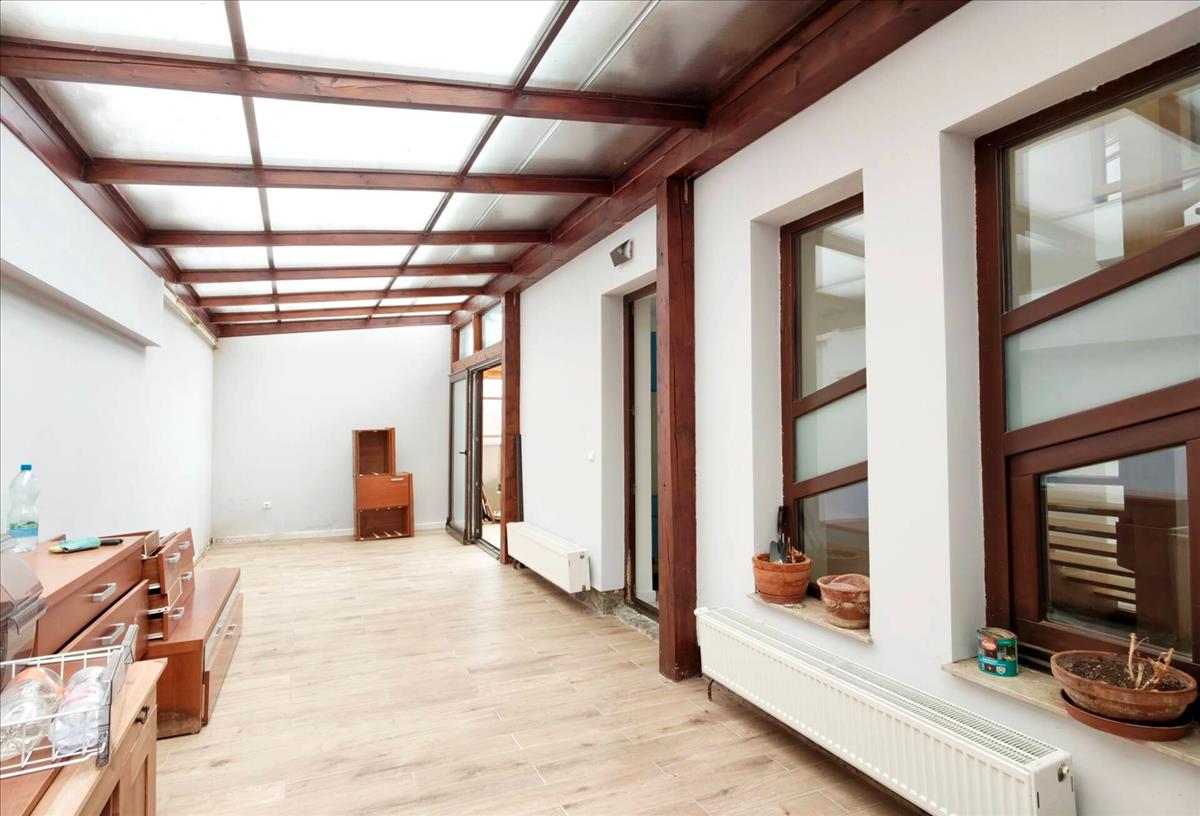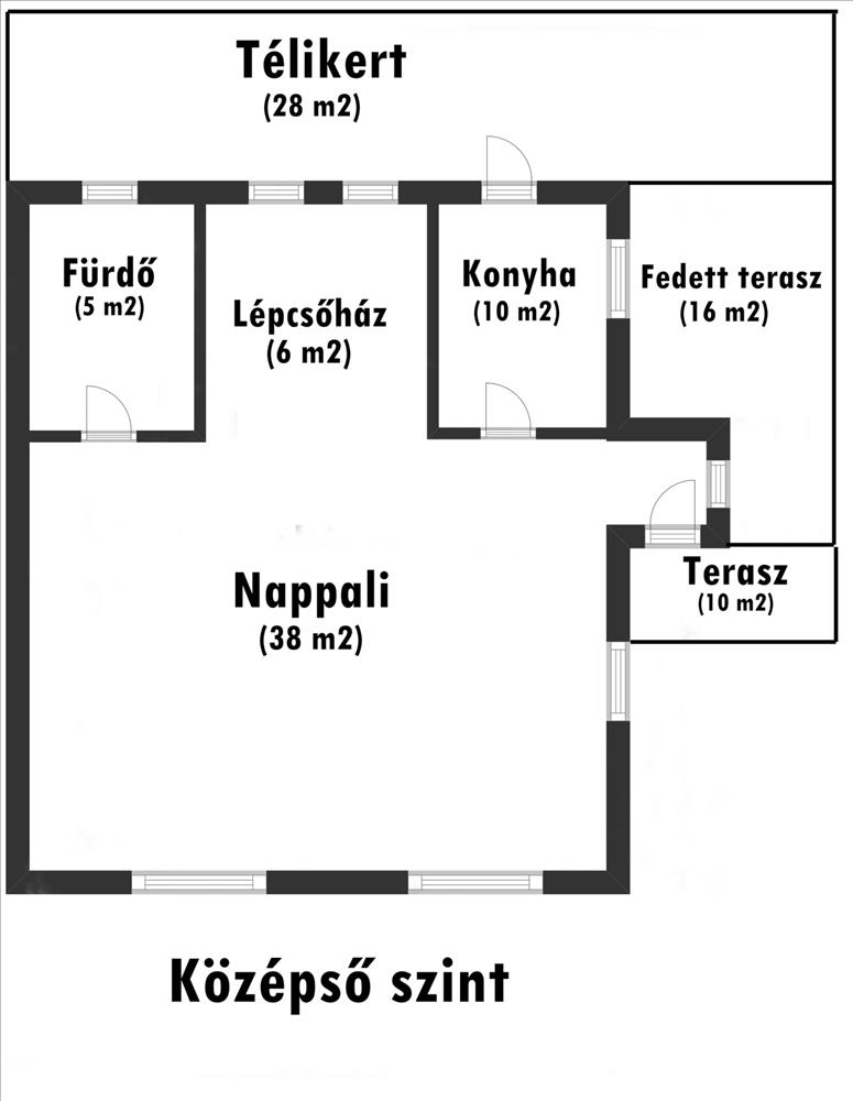 Középső szinten nappali étkezővel, külön konyha (igény szerint egybenyitható a nappalival), télikert és fedett terasz, továbbá fürdőszoba.