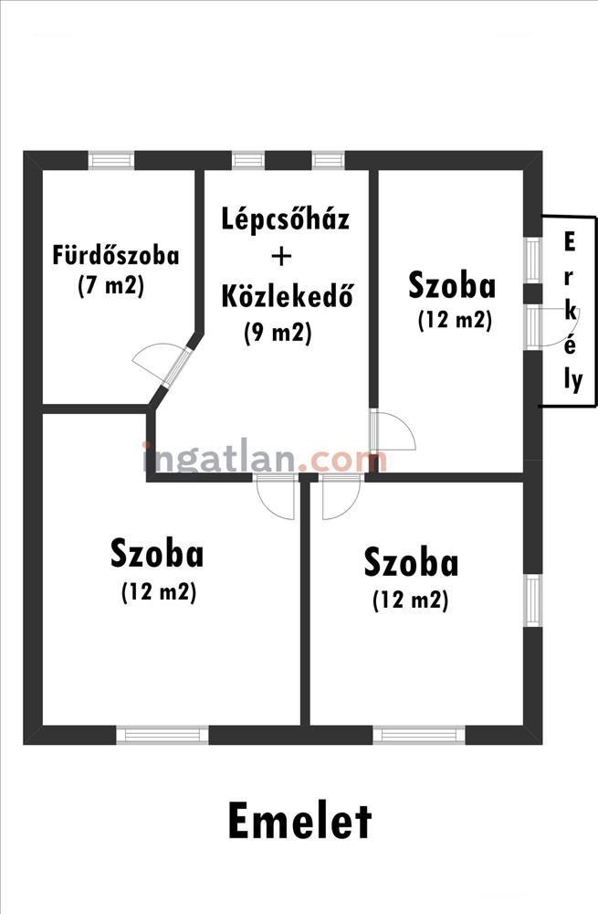 Az emeleten három tágas hálószoba (ebből az egyik erkélykapcsolatos), valamint egy fürdőszoba került kialakításra.
