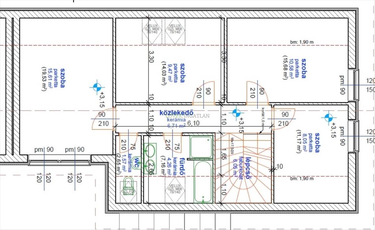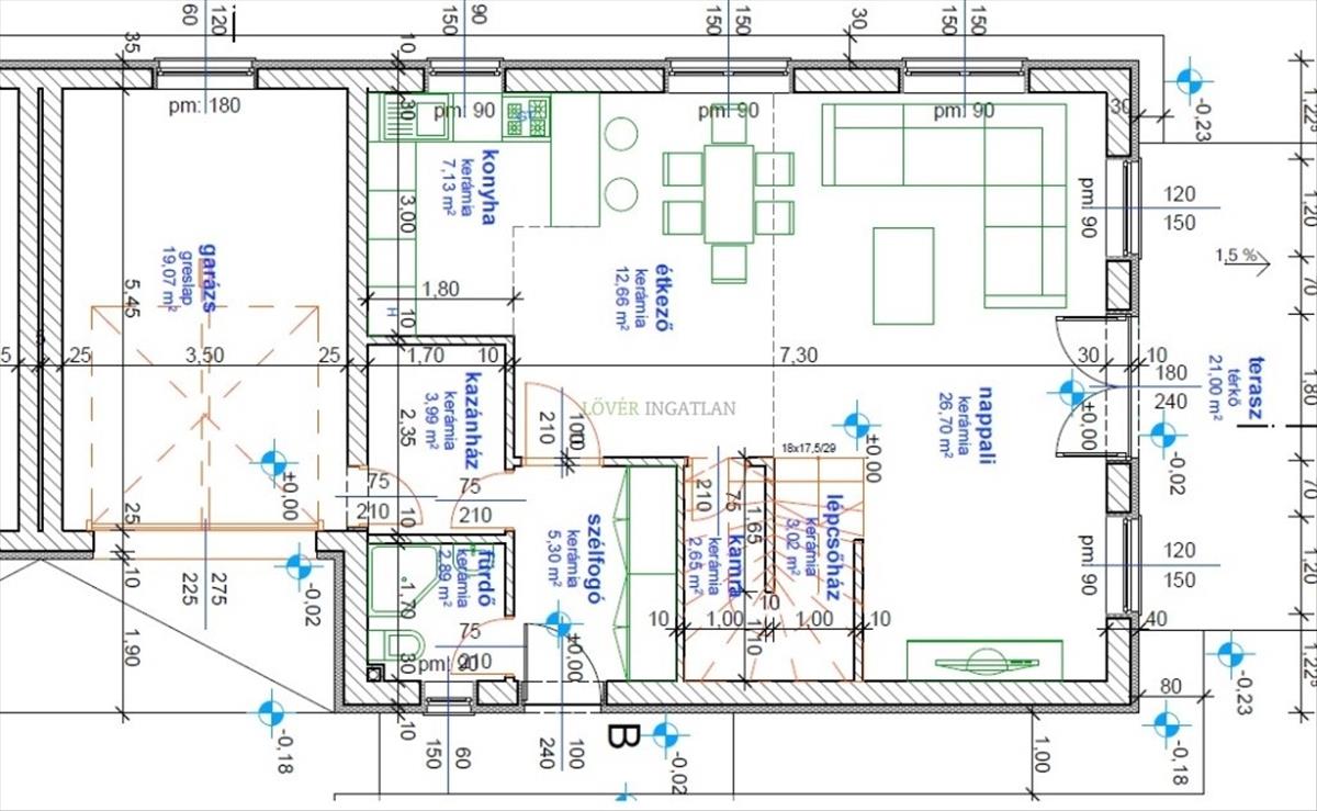 Garázs: 19 m²-es, közvetlen bejárással a lakótérbe (szélfogón keresztül).