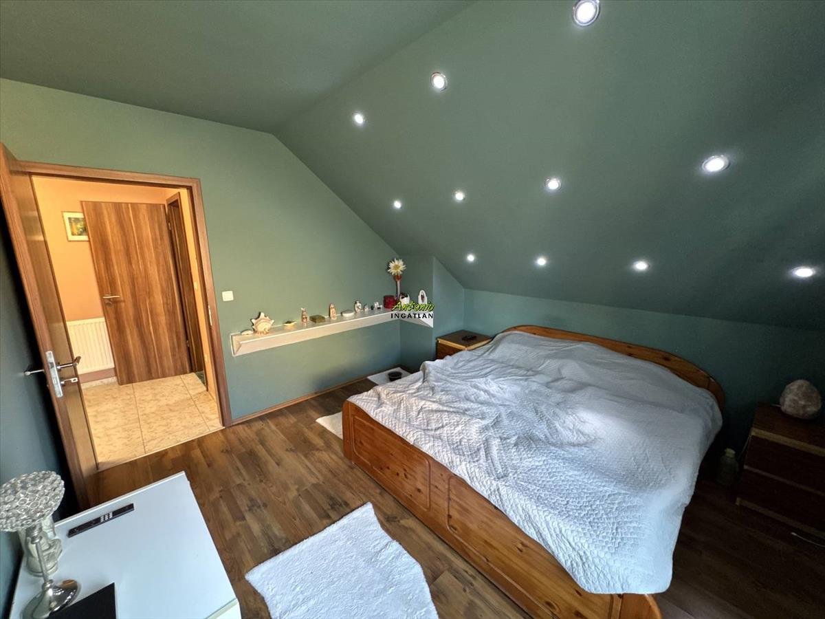 Az emeleten három tágas hálószoba, gardrób, egy sarokkádas fürdőszoba, valamint egy tágas padlás található.