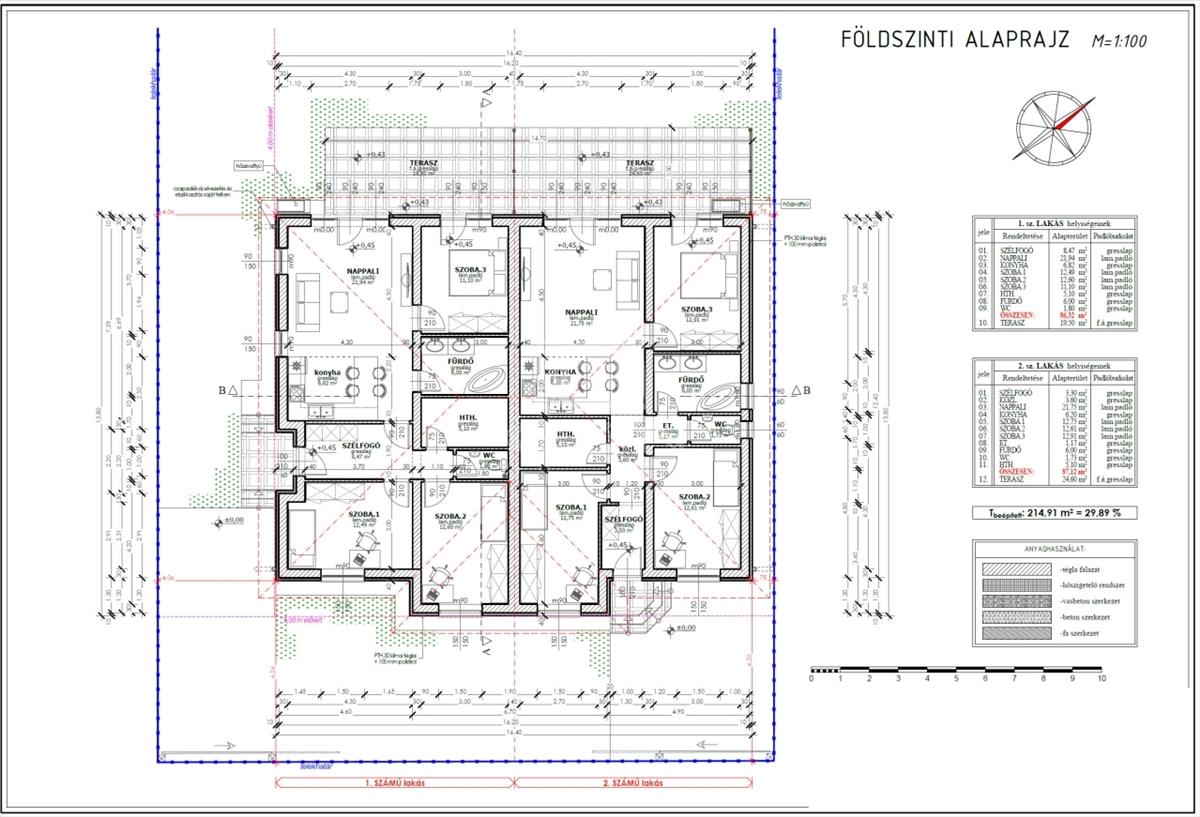Az egyik ikerfél nettó 87, 12 m² hasznos alapterülettel és 19, 5 m²-es terasszal, a másik 86, 32 m² nettó alapterülettel és 24, 6 m²-es terasszal rendelkezik. a bal oldali lakáshoz 433 m²-es, a jobb oldalihoz 302 m²-es telekrész tartozik.