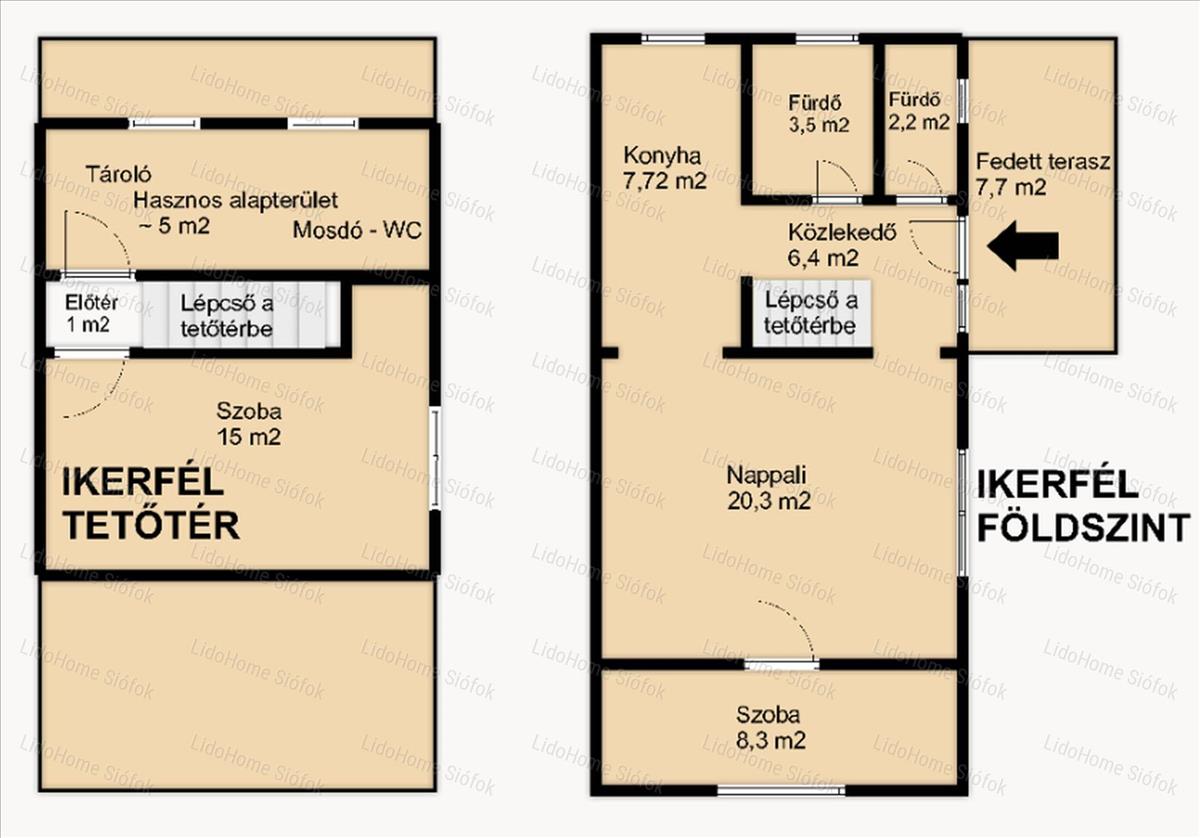 -- az ikerfélben az alsó szinten előszoba, nappali, konyha, 1 hálószoba és 2 fürdőszoba (egyik kádas, másik zuhanyozós, mindkettő WC-vel is! ). a bejáratnál egy 7, 7 m2-es fedett terasz készült