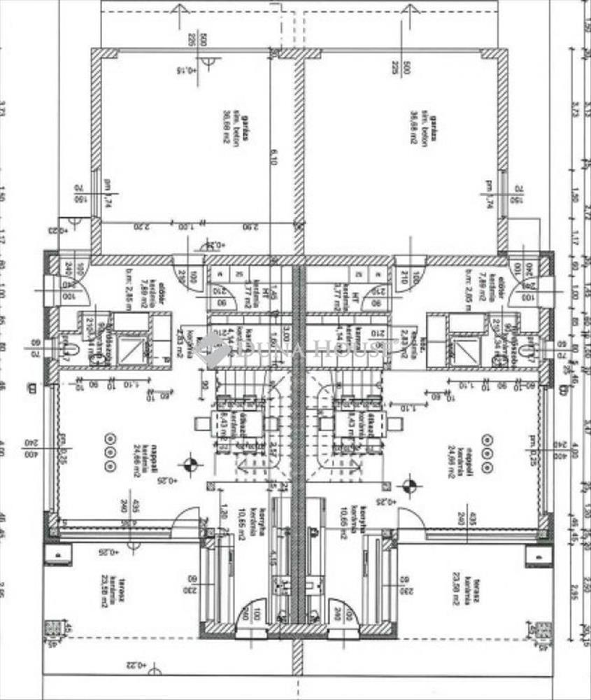 Földszint: amerikai konyha+nappali, innen nyílik a terasz, kamra, háztartási helyiség, fürdő, közlekedő, előtér, garázs (lakótér - 65, 72 m2, fedett terasz 23, 58 m2, garázs 36, 68 m2).