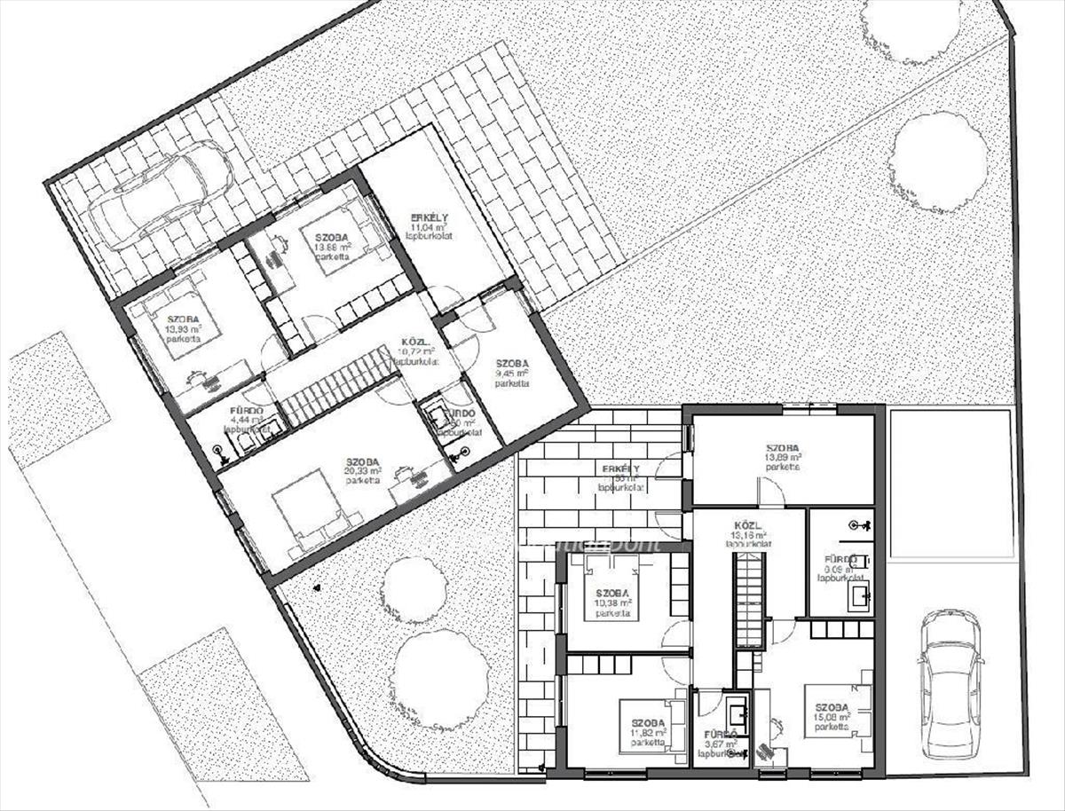 A kétszintes, garázsos ingatlan lakásonként 140 m2, 5 szoba, melyeket csak a két eladandó ingatlan minimálisan érintkezik Kertenként 301 m2 a bruttó területe.