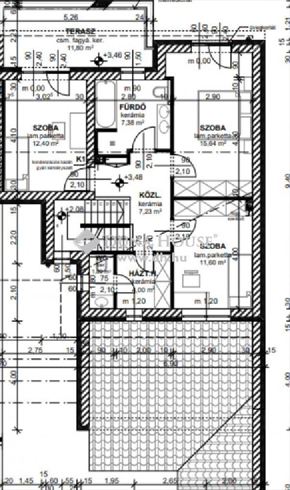 3 hálószoba (12, 40-, 15, 64-, 11, 60 m2), fürdőszoba, háztartási helyiség, emeleti terasz
