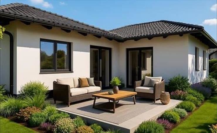 A házhoz tartozik egy 19 m²-es terasz, amely kiváló helyszínt nyújt a szabadtéri pihenéshez vagy családi/baráti beszélgetésekhez.