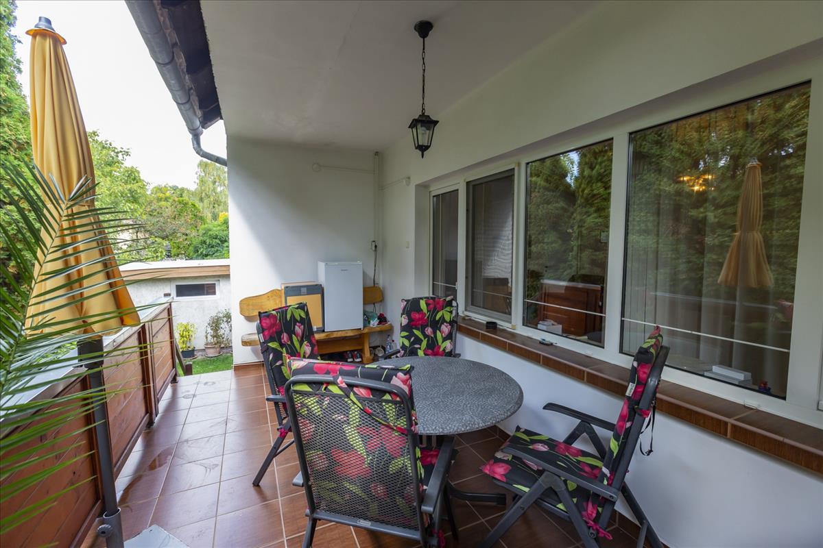 A nappaliból kellemes, nagyméretű fedett teraszra léphetünk, ahol a kerti fák közelségét élvezhetjük.