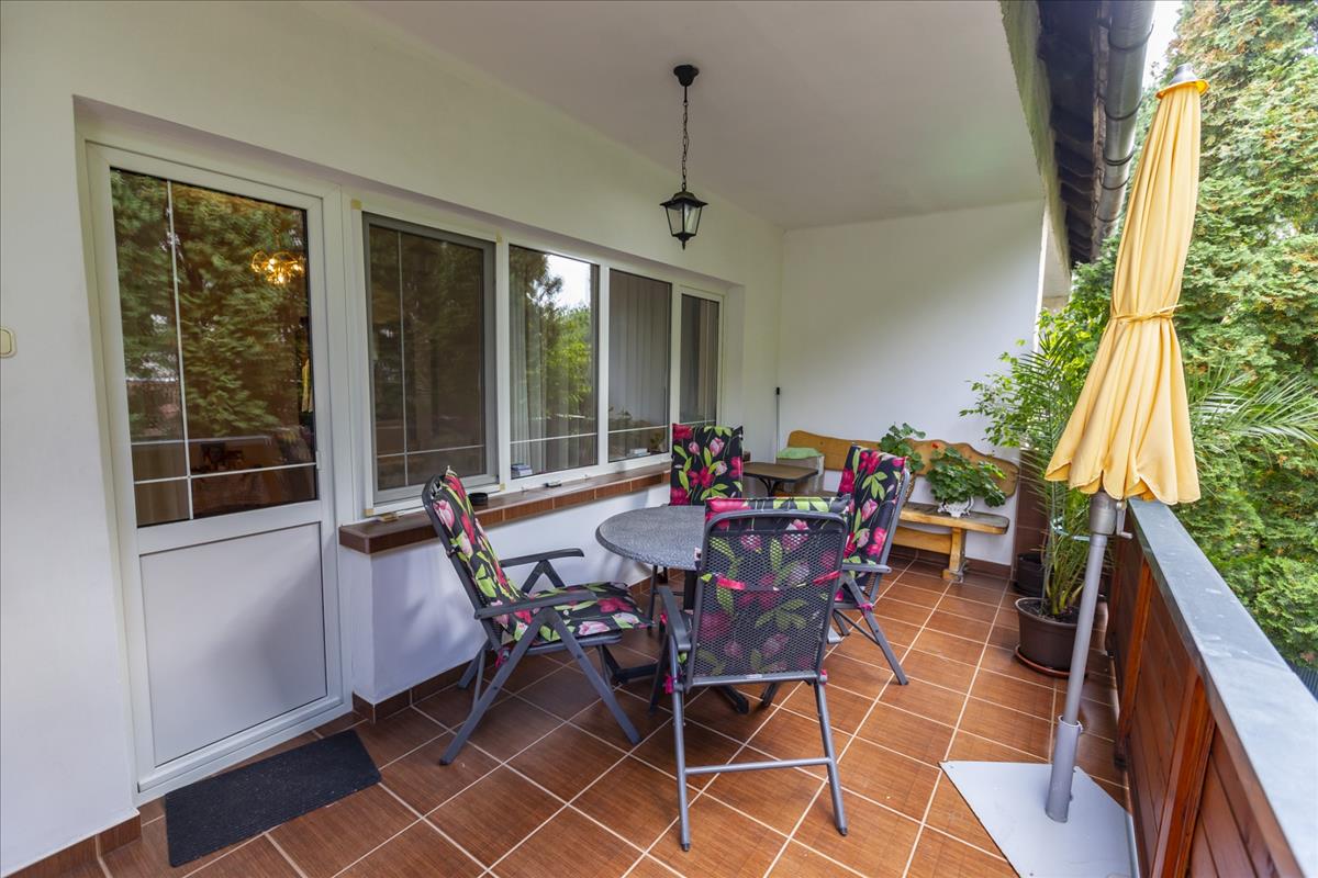 A nappaliból kellemes, nagyméretű fedett teraszra léphetünk, ahol a kerti fák közelségét élvezhetjük.