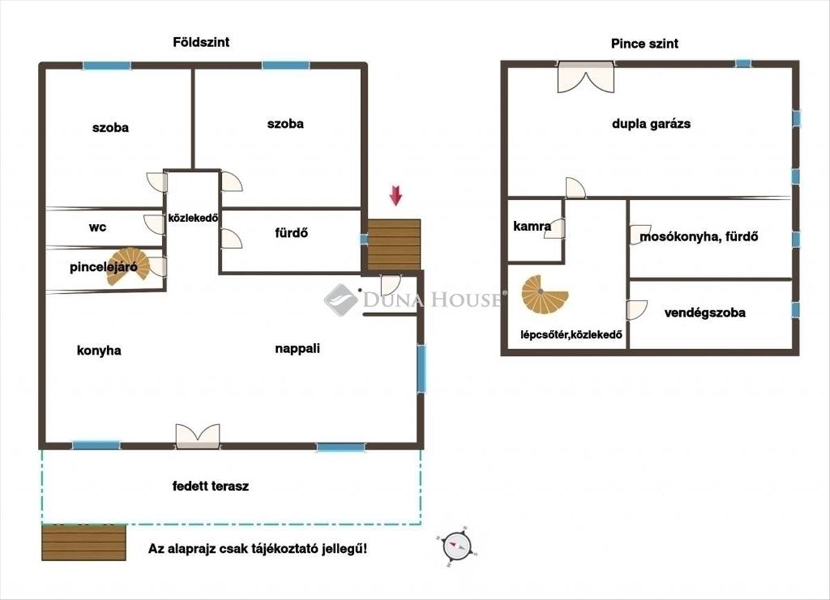 Pinceszinten dupla garázs, vendégszoba, mosókonyha (benne zuhany és egy wc is helyet kapott), kamra, található.