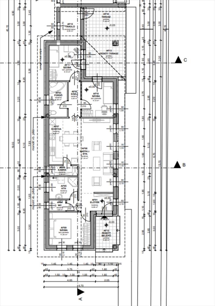 Helyiségei: nappali/étkező 27, 00 m2, szoba 11, 25 m2, szoba 9, 12 m2, szoba 9, 12 m2, konyha 5, 25 m2, fürdő szoba 5, 28 m2, közlekedő 3, 52 m2, előtér 6, 06 m2, kamra 2, 34 m2, wc 1, 50 m2, hth 5, 20 m2, fedett belépő 5, 48 m2 fedett terasz 11, 79 m2, terasz 11, 40 m2, tároló 5, 55 m2.