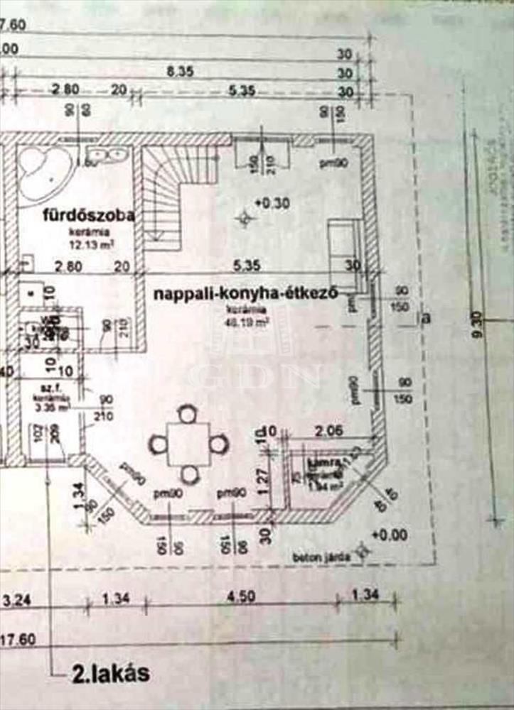 Földszint: nappali -konyha-étkező 48, 2m2, előtér 3, 35m2, fürdő 12, 13m2, toalett 1, 2m2, kamra 1m2, fedett terasz 25m2;