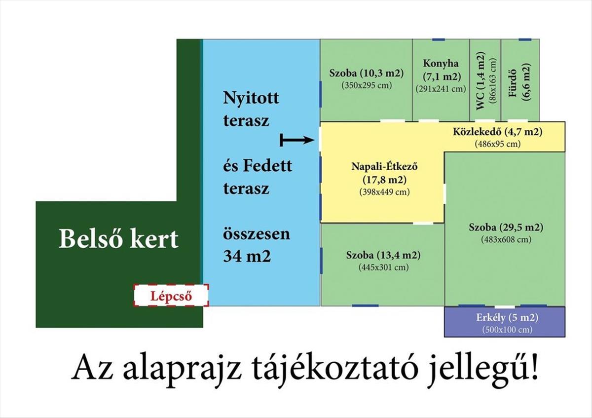 - a lakás teljes alapterülete: 98 m², hozzá tartozik egy 5 m²-es erkély és egy 34 m²-es terasz