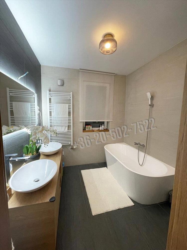 A burkolatokat Olaszországból, a design étkezőszékeket Hollandiából, és a futurisztikus - minden praktikus géppel felszerelt - konyhabútort Németországból rendelték. Természetesen mindkét fürdő is hasonló elvek mellett készült. a bútorok többsége a vételár részét képezi.