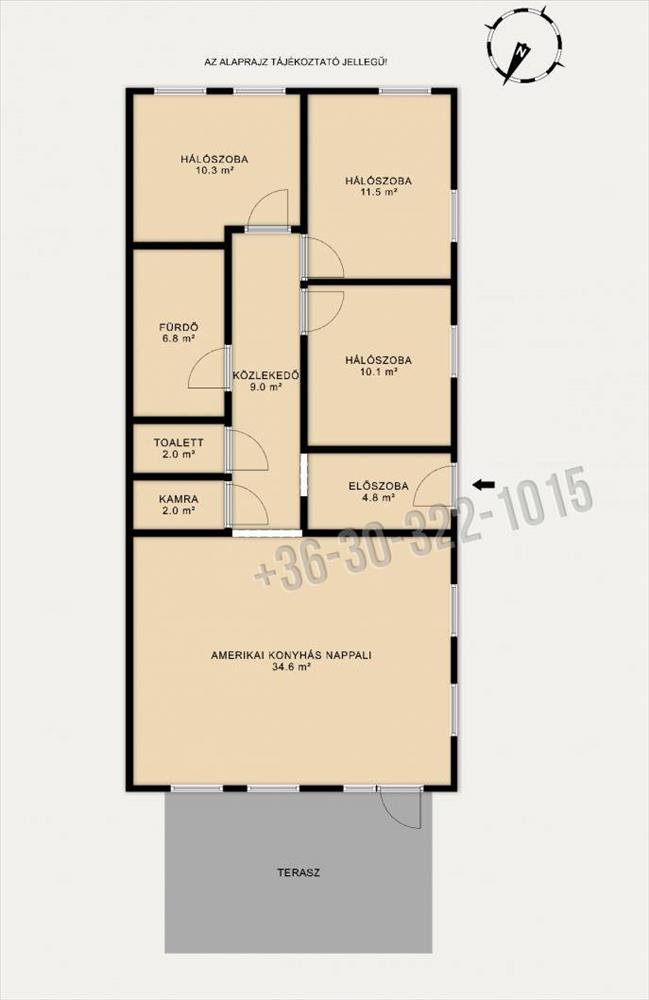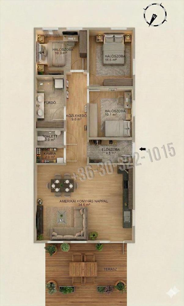 •TÁGAS életterek: Óriási, 34 nm -es amerikai konyhás nappali a közös családi pillanatokhoz, és 3 különálló, laminált parkettás hálószoba a nyugodt pihenéshez.