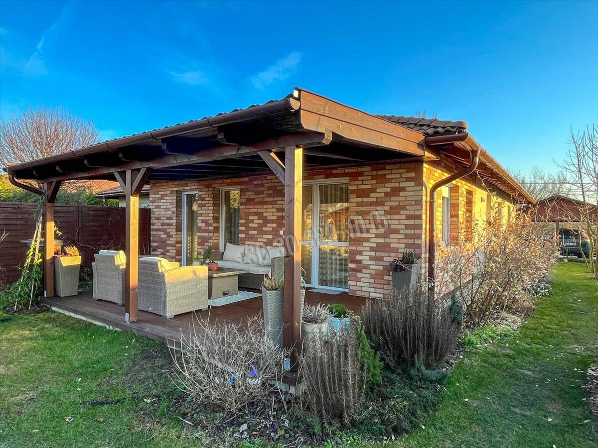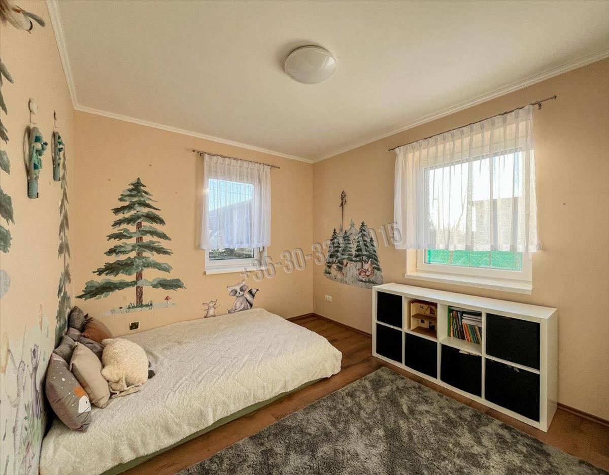 •PARKOLÁS és tárolás: a parkosított udvaron egy térkövezett, borovi fenyőből készült, cseréplemez fedésű fedett gépkocsibeálló védi az autót, a kerti holmiknak pedig egy 9 nm -es tároló nyújt helyet.