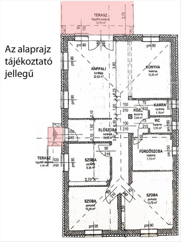 Helyiség lista: Nappali: 22, 83 m2, Konyha: 12, 30 m2, Háztartási helyiség: 1, 76 m2, wc: 1, 76 m2, Fürdőszoba: 7, 13 m2, Szoba: 13, 72 m2, Szoba: 10, 10 m2, Szoba: 8, 36 m2, Közlekedő: 2, 64 m2, Előszoba: 10, 72 m2
