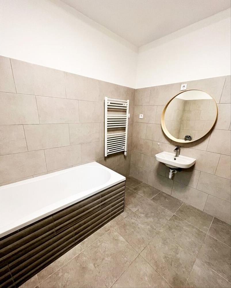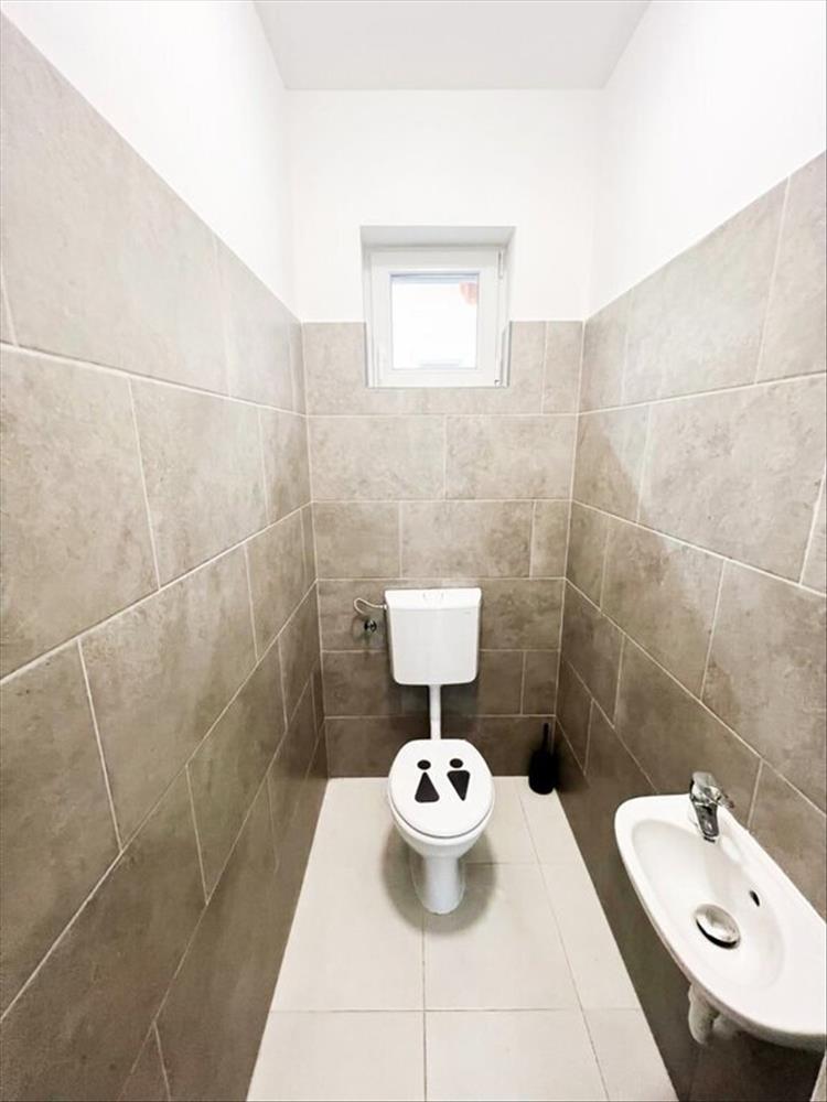 A fürdőszoba kádas, ablakos, WC-vel és elektromos törölközőszárítóval.
