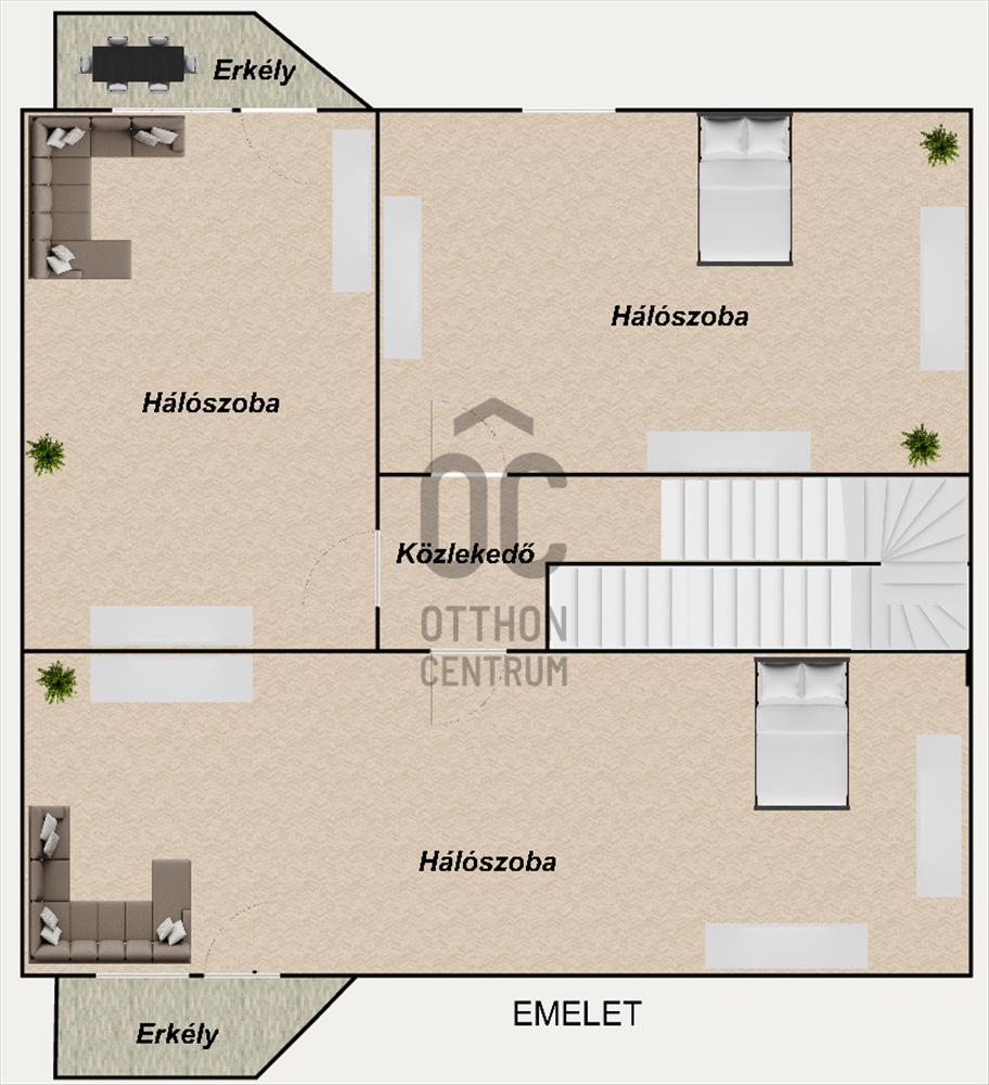A földszinten egy tágas amerikai konyhás nappali adja az otthon központját, ahonnan közvetlen kijárat nyílik a fedett teraszra – ideális helyszín családi reggelikhez vagy esti kikapcsolódáshoz. Emellett fürdőszoba WC-vel, tároló és előszoba is helyet kapott. Az emeleten három külön nyíló szoba biztosítja a privát szférát, míg két szobából erkély is elérhető, ami tovább növeli a térérzetet és a komfortot.