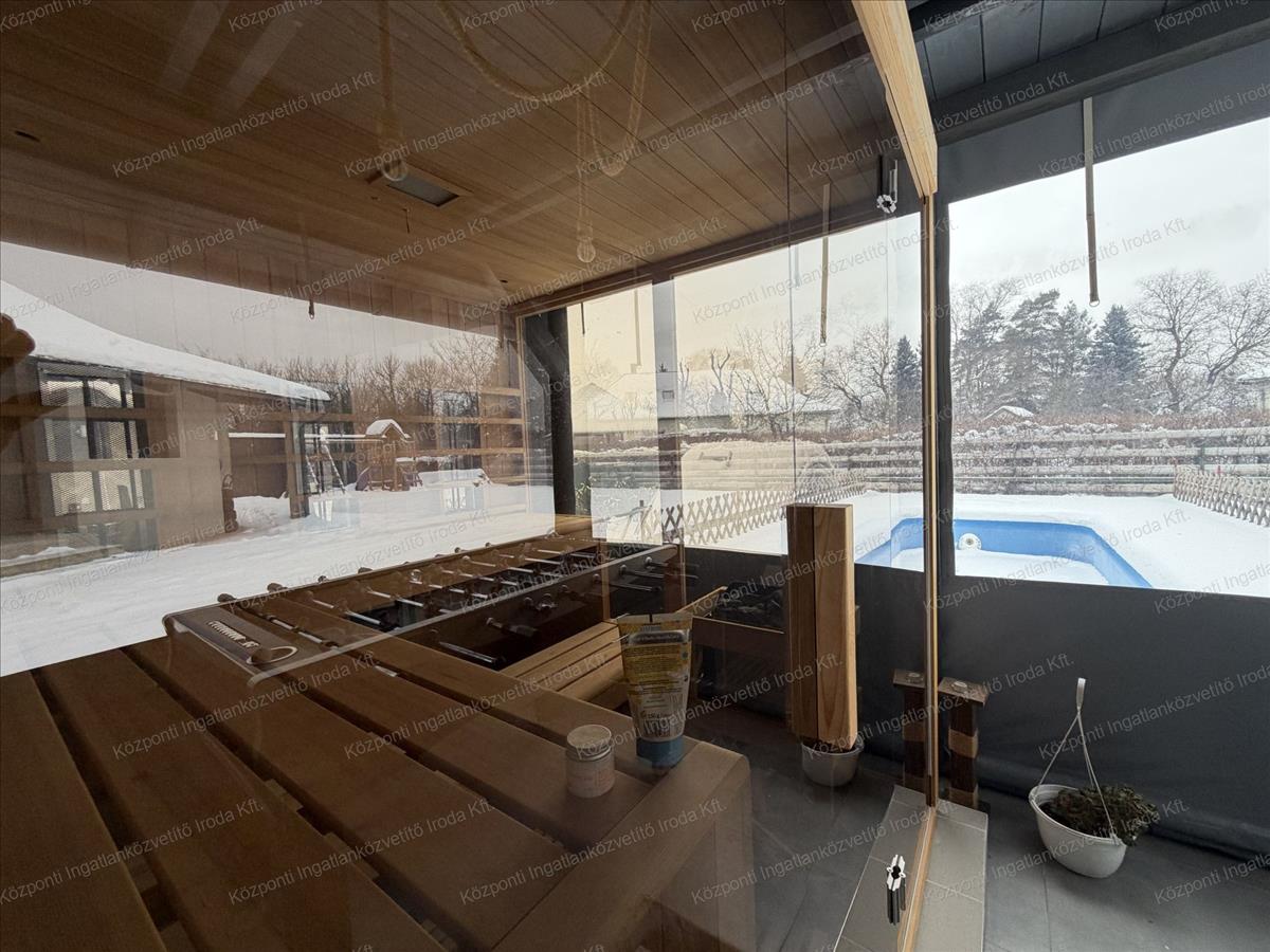 A melléképülethez kapcsolódik egy körülbelül 45 m²-es, fedett terasz, ahol finn–infra kombinált szauna került beépítésre. a terasz fűtése sparheltról és gázos kiegészítő fűtéssel is megoldható a teli időszakban, így az év nagy részében használható. a teraszon egy teljesen felszerelt konyha is helyet kapott beépített sütővel, főzőlappal és mosogatógéppel.