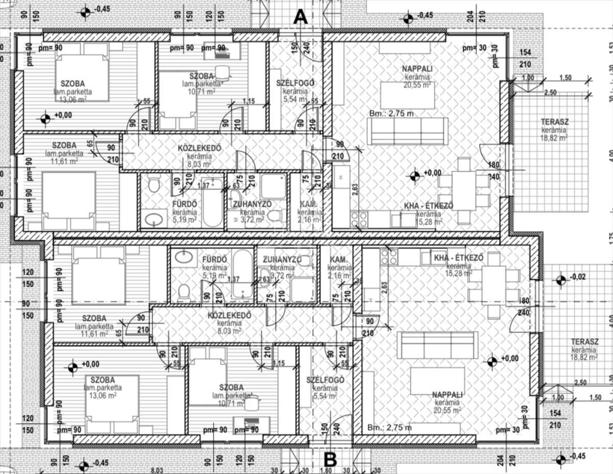 Lakótér: 3 hálószoba, amerikai-konyha, kamra, duplakomfort, terasz.