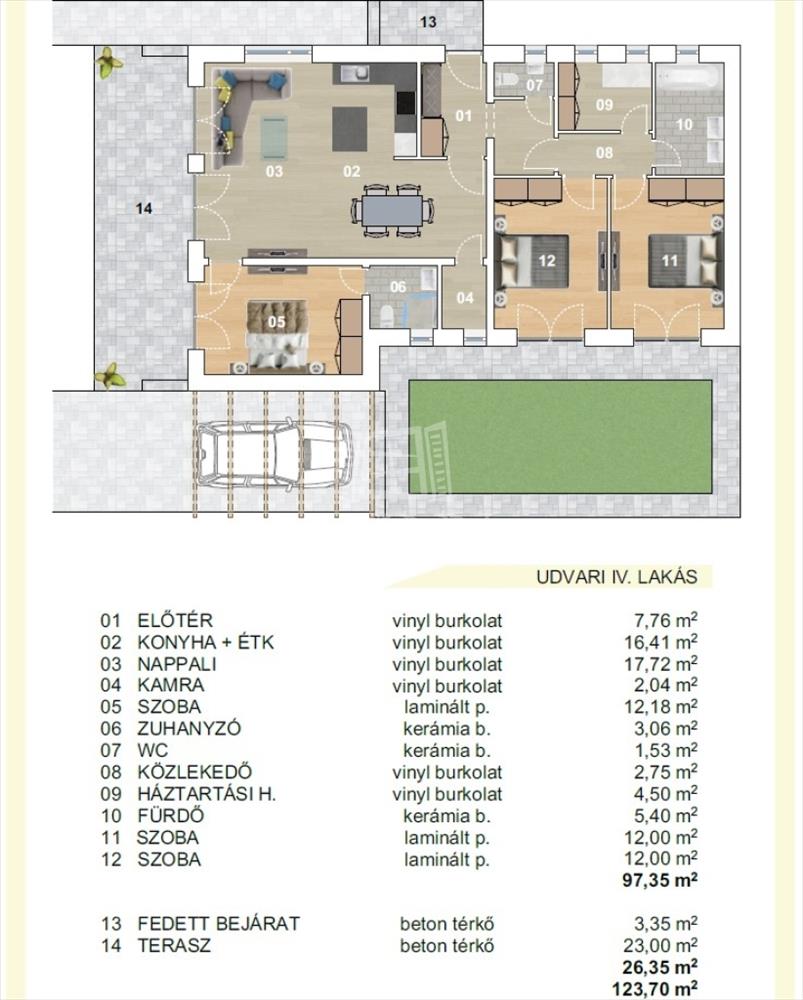 Burkolatok: Vinyl és laminált padlók, kopásálló hidegburkolat, burkolati keret: 5. 000 Ft/m²-ig választható