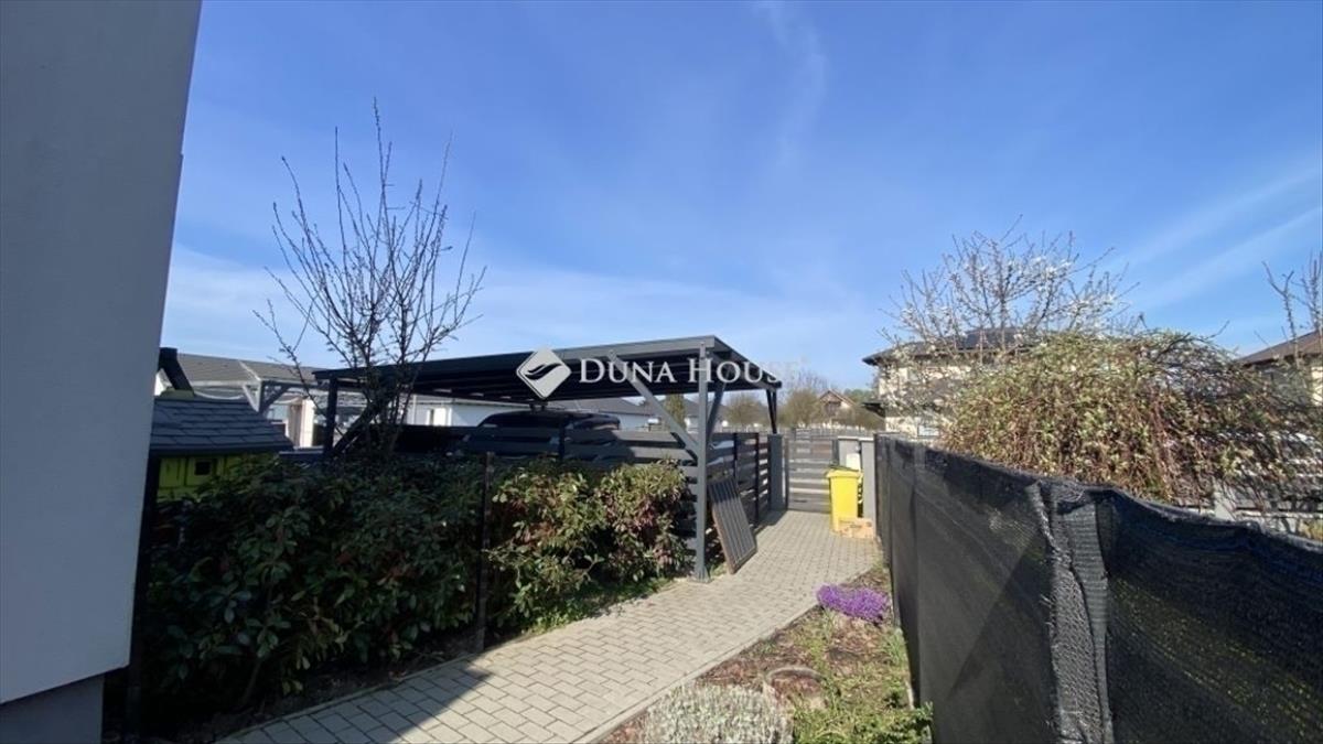 A saját kertrész a nappaliból a teraszon át is megközelíthető, a sarokban egy praktikus tároló is helyet kapott. a parkosított udvar kiváló lehetőséget biztosít pihenésre vagy családi kikapcsolódásra. Az ingatlanhoz fedett kocsibeálló is tartozik.