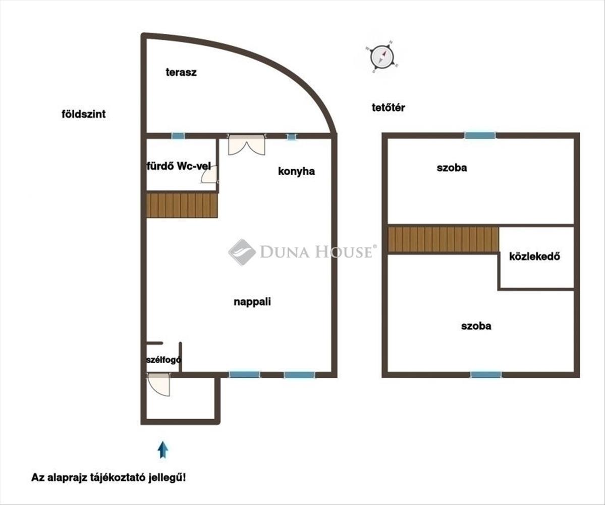 A lakás földszinti részén szélfogó, előszoba, nappali, konyha, fürdő, a tetőtérben közlekedő és két háló található. a hátsó kert kívülről és a konyhából nyíló ajtón keresztül a teraszon át is megközelíthető.
