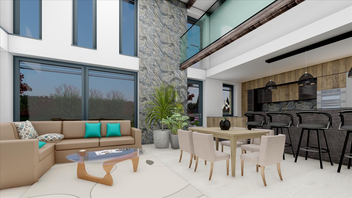 A magas, zárt kerítés teljes intimitást biztosít – mégis nyitott a térre, a fényre, a levegőre. Itt egyszerre élhető meg a társasági élet öröme és a magányos nyugalom méltósága.
