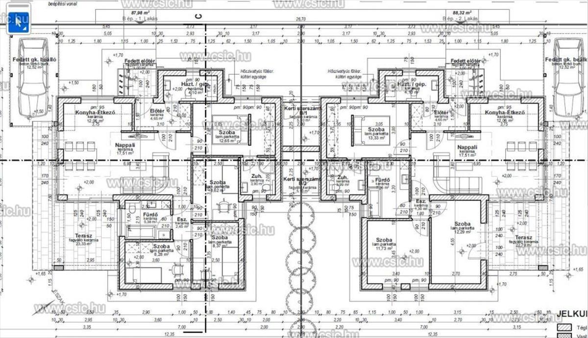 Ikerházak beosztása: tágas 30 nm -es amerikai konyhás nappali, külön nyíló 3 hálószoba(11, 7-12, 3-13, 3) Két fürdőszoba WC-vel. a szülői hálóhoz külön bejáratú fürdőszoba tartozik. Vendég wc, háztartási helység, előtér, fedett előtér. Mindegyikhez 23 nm -es fedett terasz, kocsibeálló, fedett kerti tároló, 436-440 nm -es telek tartozik.