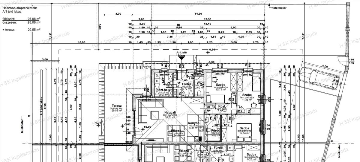 A lakás bruttó területe 108 nm, nettó lakóterülete 93, 08 nm + 29, 55 nm terasz, amerikai-konyhás nappali + 3 szobával, 508 nm-es kizárólagos használatú telekrésszel.