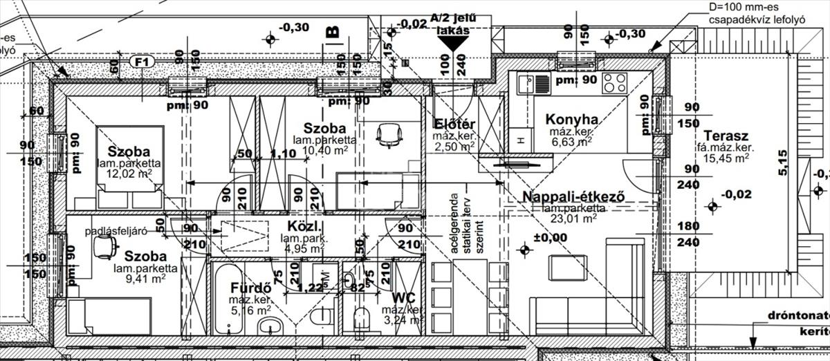 A DK-i tájolású ház tégla falazattal, 3 rétegű műanyag nyílászárókkal, 10 cm-es grafit szigeteléssel és cserép héjazattal épült. a fűtést korszerű hőszivattyú és padlófűtés biztosítja, a meleg vizet pedig egy 100 literes villanybojler szolgáltatja. a nyári komfortot klímaberendezés segíti.