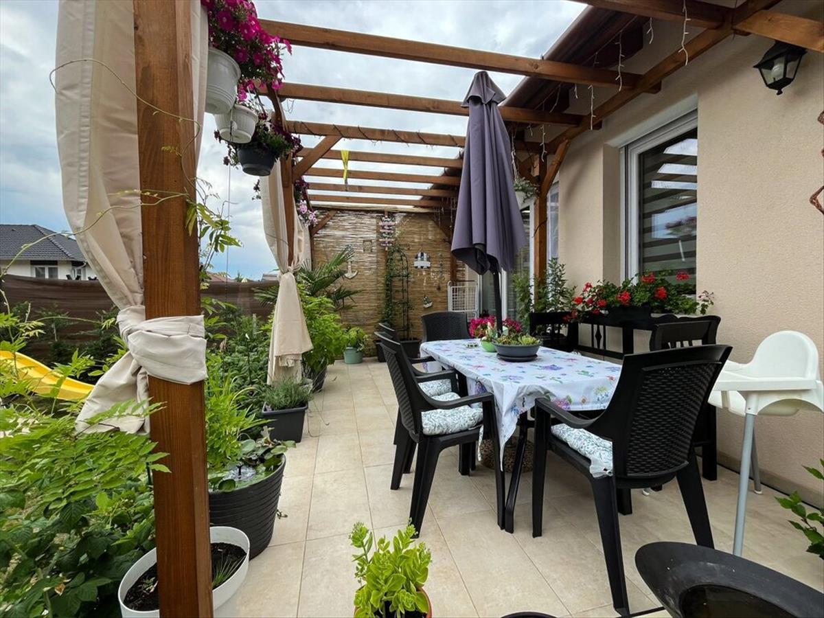 A 15, 45 m²-es, pergolával fedett terasz a ház egyik legjobb része. Nem csupán egy kültéri burkolt felület, hanem a lakótér természetes meghosszabbítása. Tavasztól őszig reggelizőhelyként, családi étkezések színtereként, esti beszélgetések helyeként működik, és pontosan azt az életérzést adja, amit az emberek egy kertkapcsolatos háztól várnak.