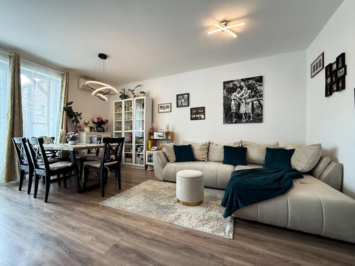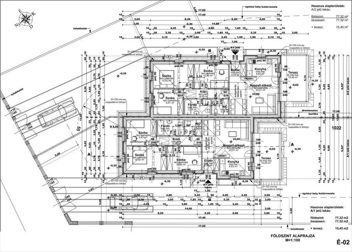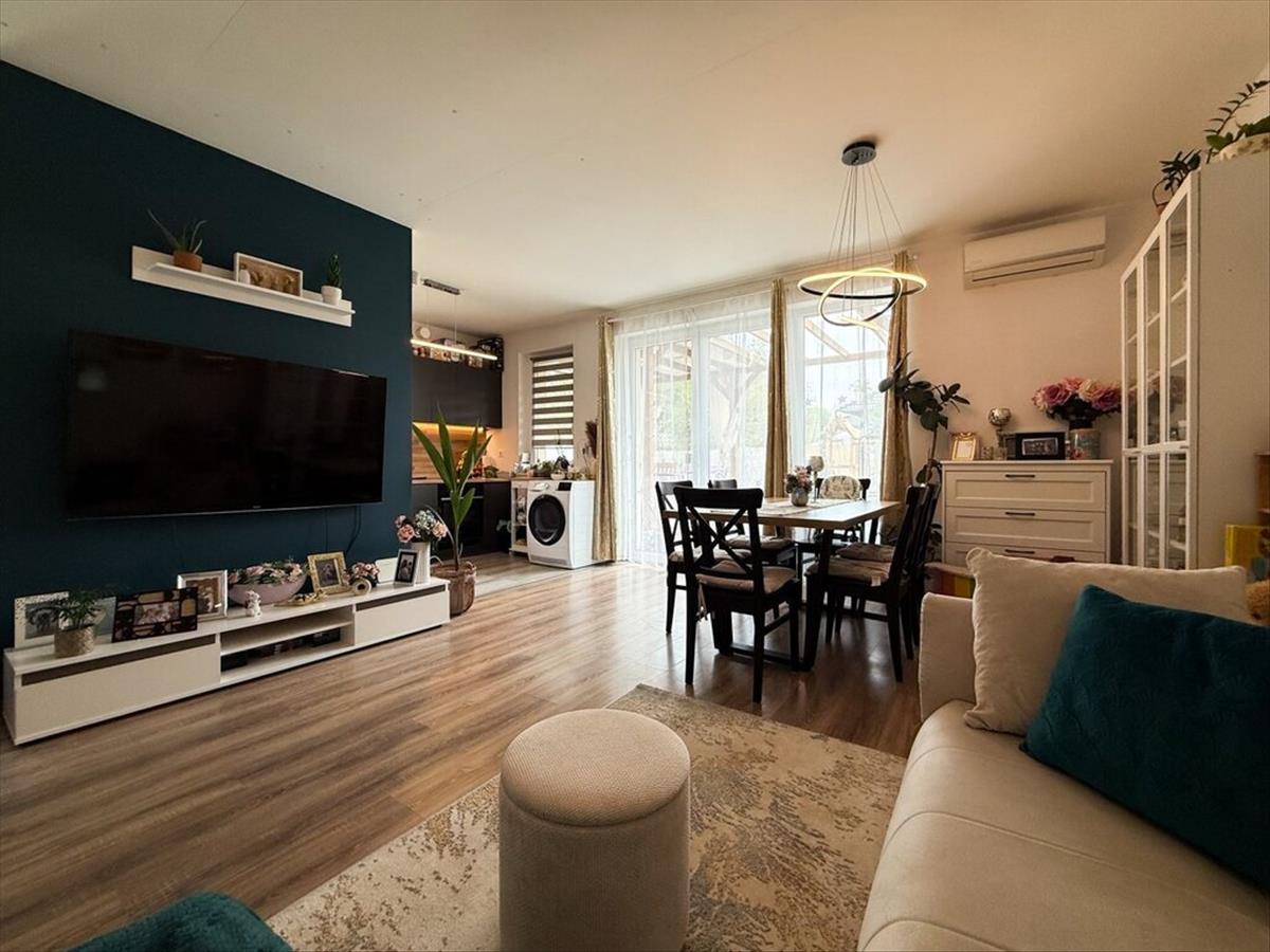 A ház hasznos alapterülete 77, 32 m², amelyhez egy 15, 45 m²-es, pergolával fedett terasz kapcsolódik. Az elosztás átgondolt, családi használatra kifejezetten jól működik: amerikai konyhás nappali-étkező, 3 külön nyíló hálószoba, 2 fürdő, előtér és közlekedő alkotja a belső tereket. Ez az a típusú ingatlan, ahol minden négyzetméternek funkciója van, nincs elvesző tér, nincs felesleges kompromisszum.