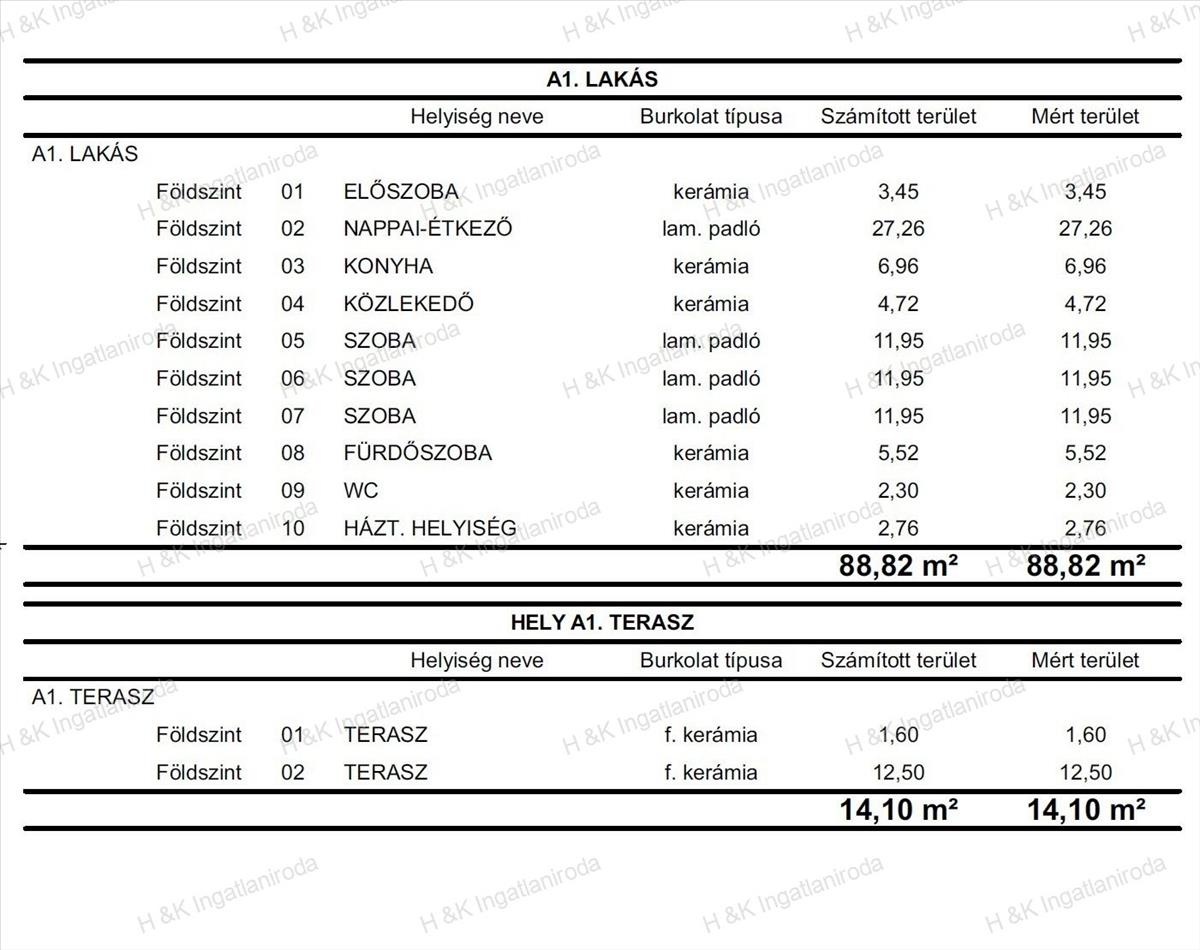 Helyiségek: nappali-étkező 27, 25 nm, 3 hálószoba – mindhárom 11, 95 nm, fürdőszoba 5, 52 nm, közlekedő 4, 72 nm, előszoba 3, 45 nm, háztartási helyiség 2, 76 nm, konyha 6, 96 nm, külön wc 2, 39 nm, teraszok 12, 5 nm és 1, 8 nm