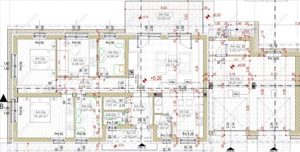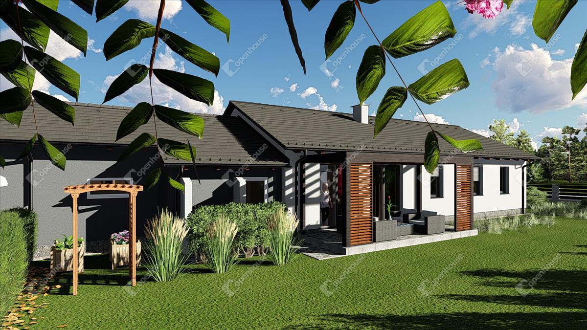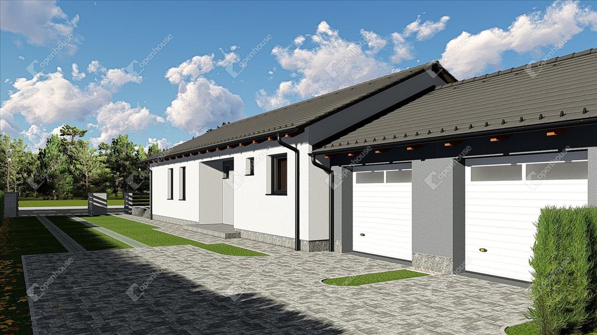 Helyiségek: amerikai konyhás nappali, 3 szoba, 2 fürdőszoba WC-vel, plusz 1 külön wc, szélfogó, közlekedő, gardrób, kamra, dupla garázs, gépészeti helyiség, terasz 15 m².