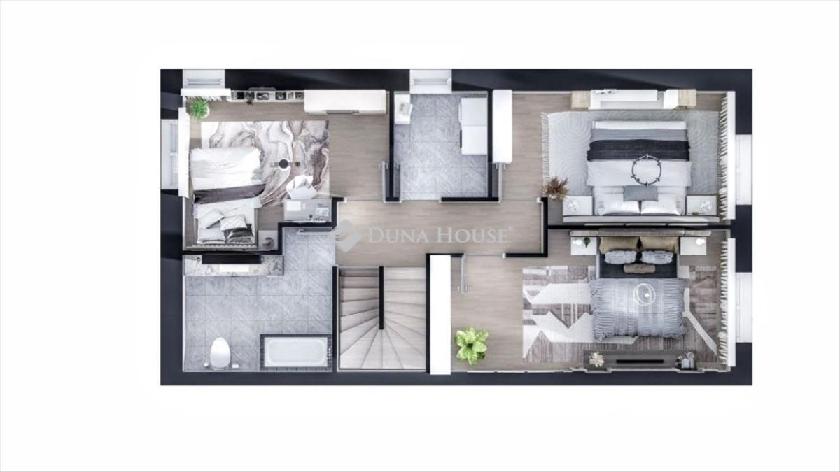 A felső szintre jutva jobbra még egy fürdőszoba, szemben egy szoba található. a lépcsőfeljáróval szemben a háztartási helyiség áll rendelkezésre. Balra két hálószoba található.