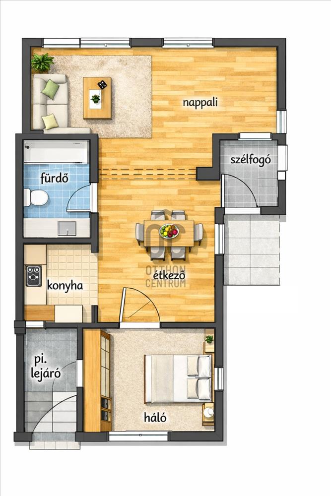 • Földszint: amerikai konyhás nappali–étkező, hálószoba, fürdőszoba mellékhelyiséggel