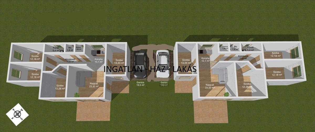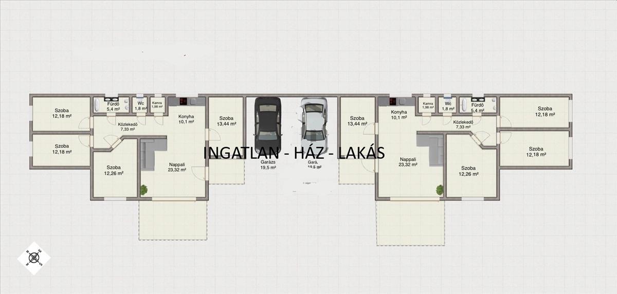 Az épület alkalmas két család részére, földszintes elrendezésben, tükrözött alaprajzzal.