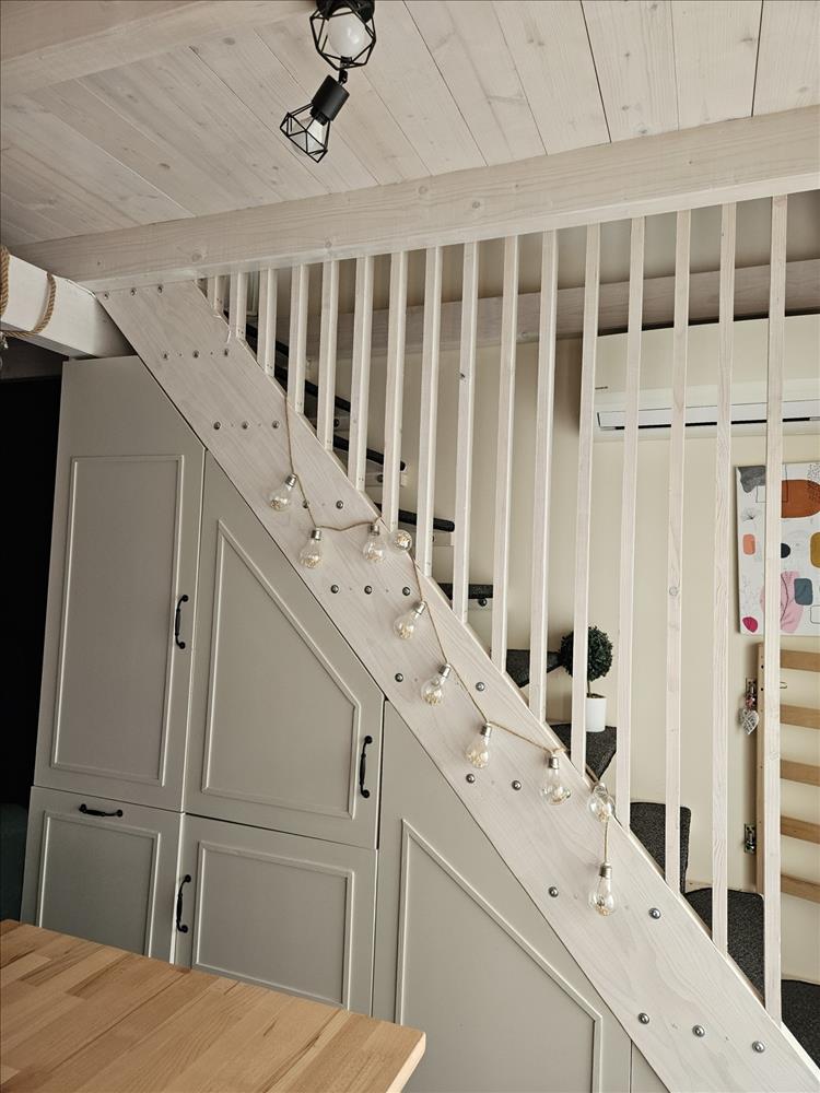 2022-Ben a nappali fölött egy 31 m2-es galéria került kialakításra lucfenyőből.