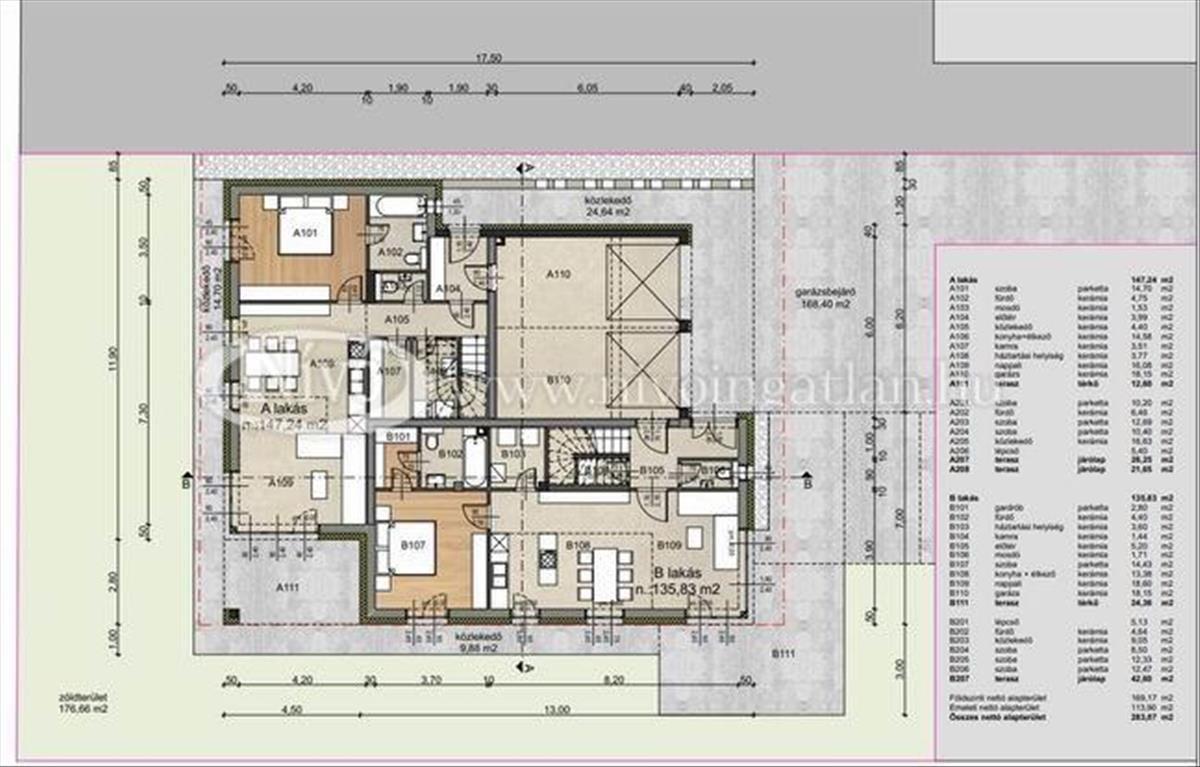 A két ikerházrész összesen 700 m2-es telken helyezkedik el, a B ikerházrészhez is használati megosztással saját használatú parkosított, 280 m2 kertrész tartozik. a telek területe 280 m2 összesen, mely úgy oszlik meg, hogy 90 m2 privát terület, 190 m2 pedig osztatlan közös tulajdonrész.