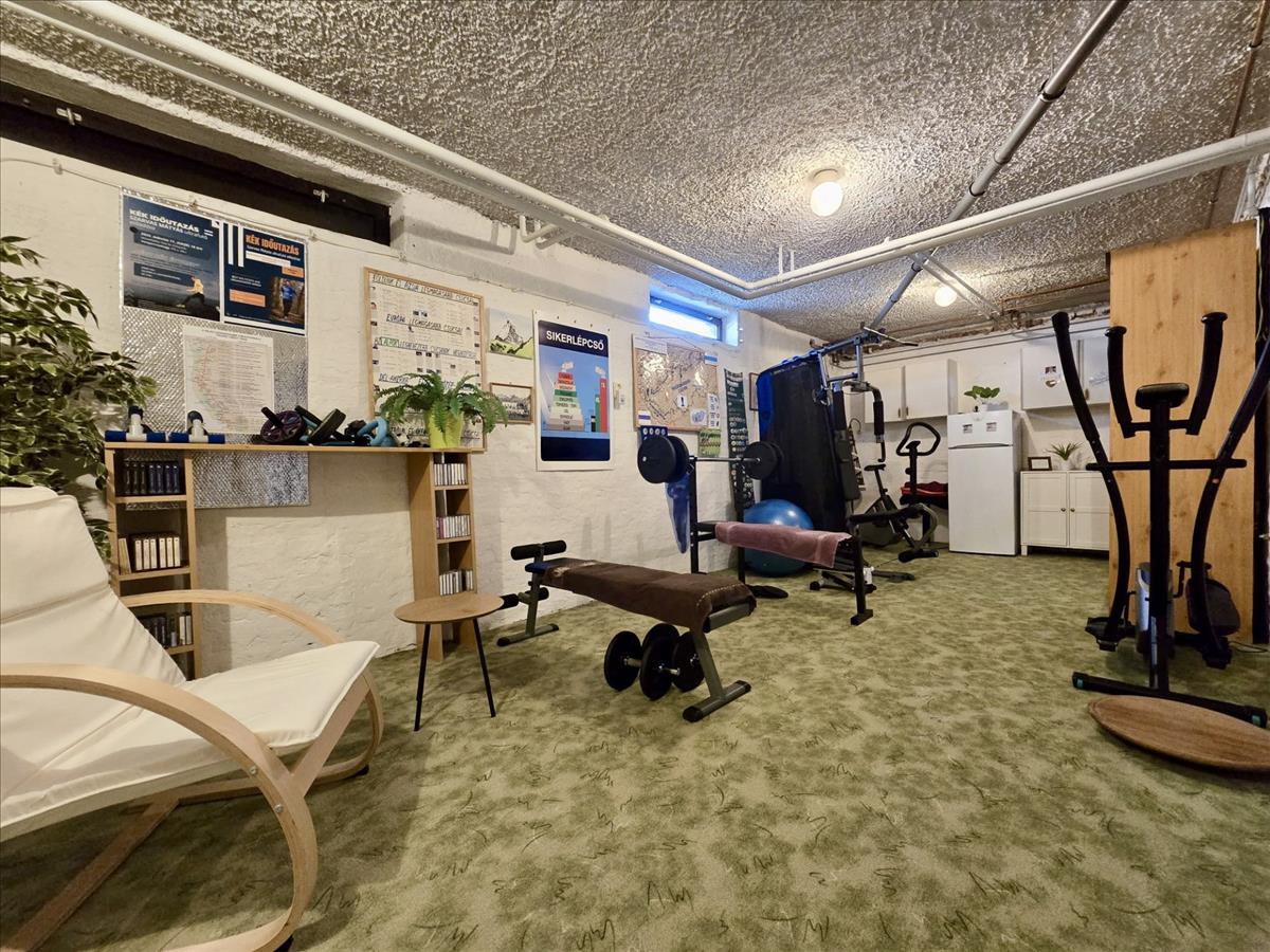 Az alsó szint jelenleg fitness helyiségként funkcionál, amely kiválóan alkalmas edzőtérnek, hobbihelyiségnek vagy akár privát wellness-részlegnek.