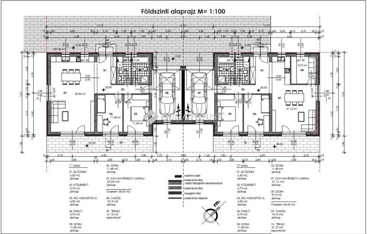 Az ikerfeleket hangszigetelő téglafal, és a garázsok is szeparálják egymástól, minden a legújabb energetikai elvárásoknak megfelelően kerül kivitelezésre.