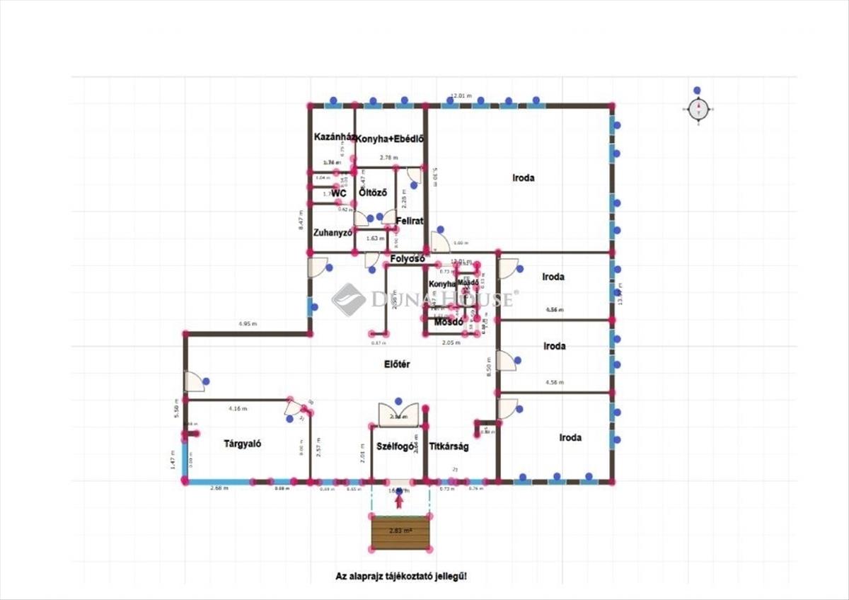 535 m²-es, korszerű iroda- és bemutatótér (recepció, tárgyalók, öltözők, zuhanyzók, étkező)