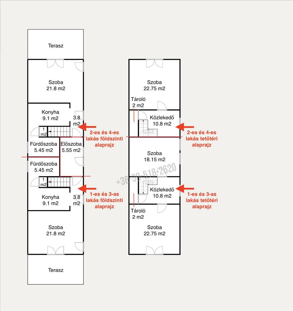 A két ház elrendezését tekintve megegyeznek egymással, az épületekben két-két lakótér található. Az alaprajzban szemléltetett számozás szerint az 1-es és 3-as apartmanban három kényelmes és világos szoba, konyha, közlekedők, fürdőszoba, tárolók és terasz lett kialakítva. a 2-es és 4-es lakásokban pedig két szintén világos és tágas szoba, konyha, közlekedők, fürdőszoba, tárolók és hangulatos terasz található.